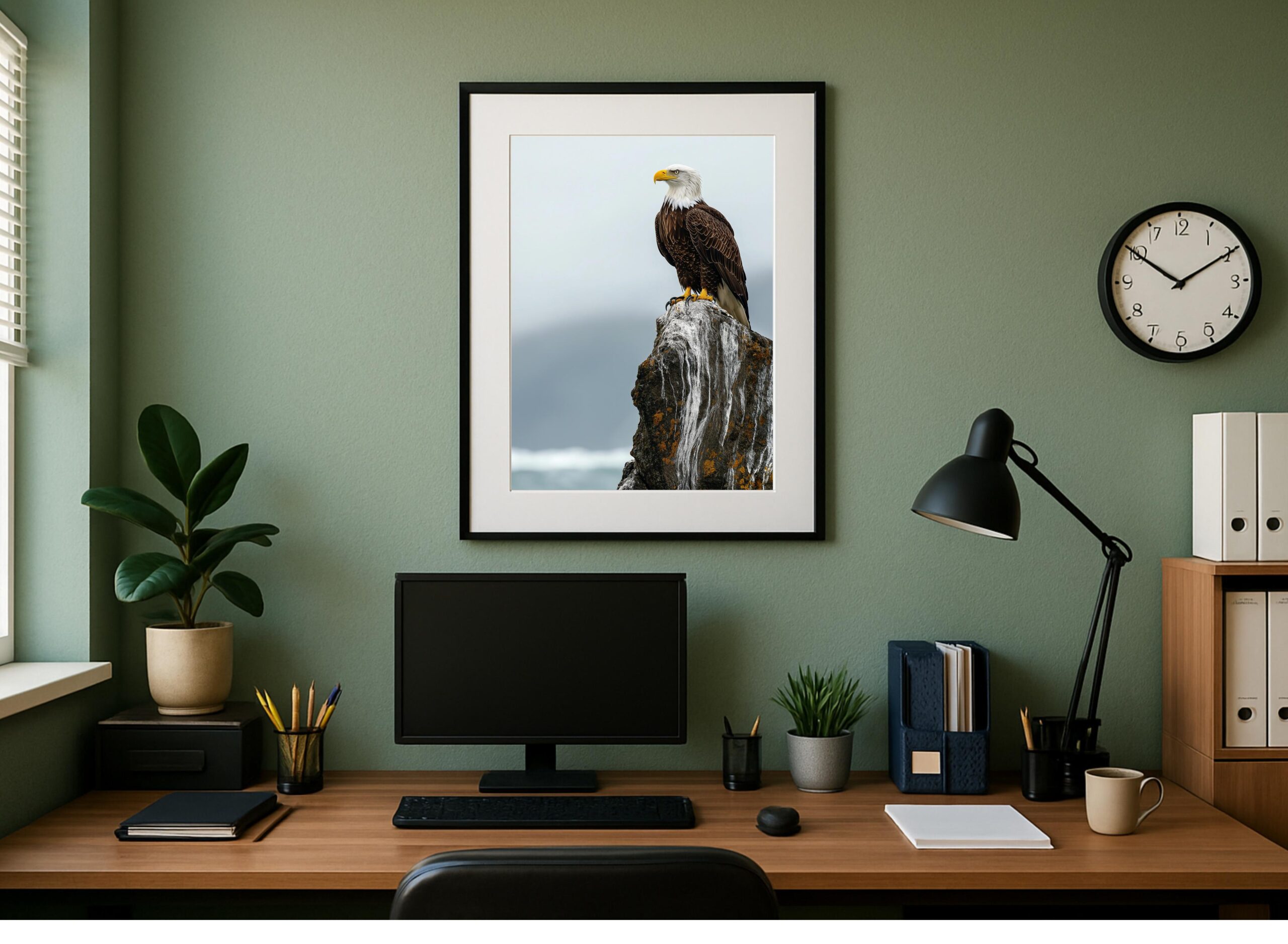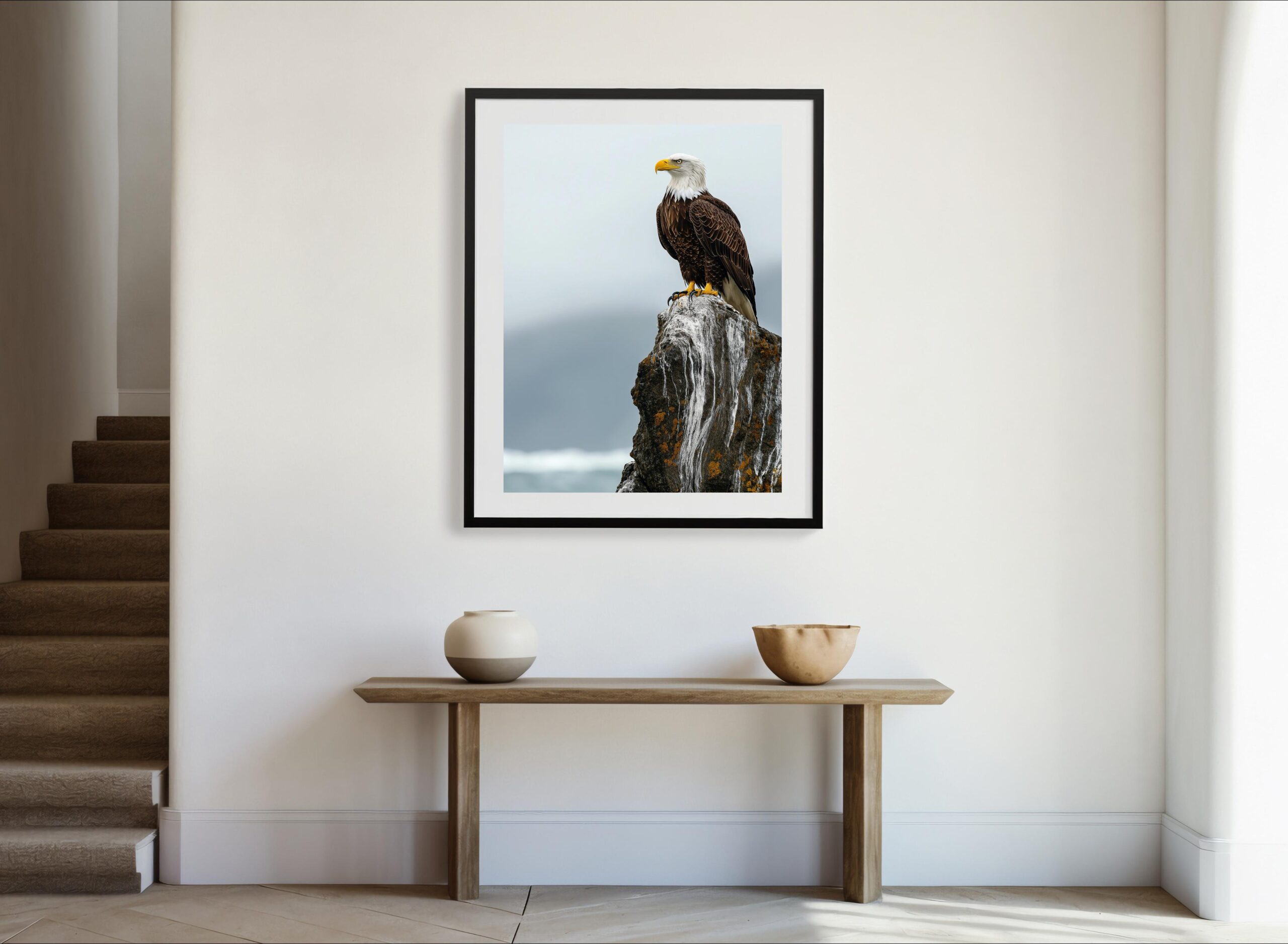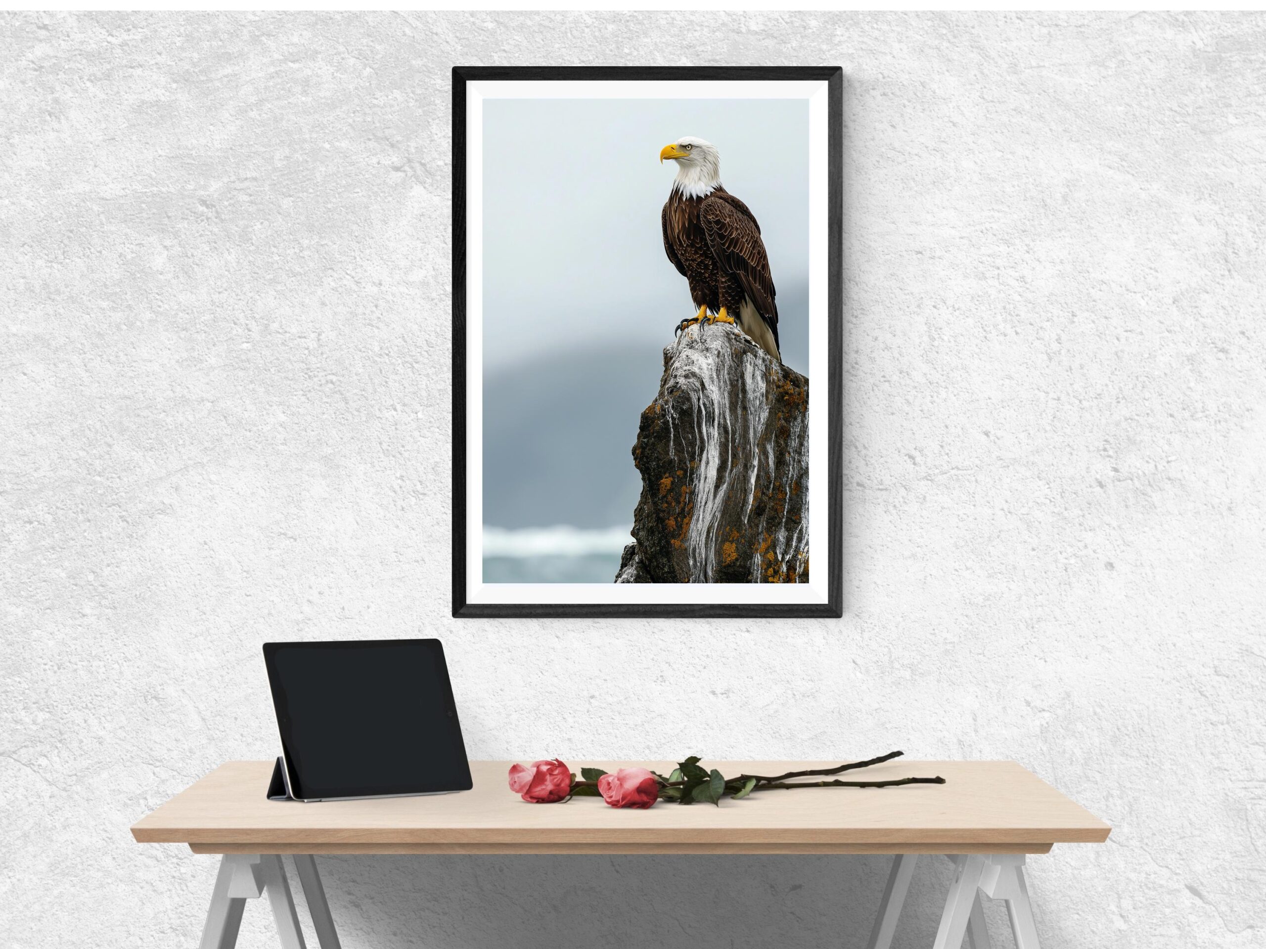 Bald eagle wall art captures the majestic predator perched on a rugged cliff against a serene, misty backdrop. The rich details and earthy tones create a captivating image, blending seamlessly with modern and rustic decors. This striking piece brings a sense of strength and freedom, making it an ideal centerpiece for a living room or office. The muted gray and blue hues of the sky contrast beautifully with the eagle’s striking plumage, invoking a calm yet powerful mood. Perfect for nature enthusiasts, this artwork transforms any space into a tranquil haven, adding personal touch and sophistication.