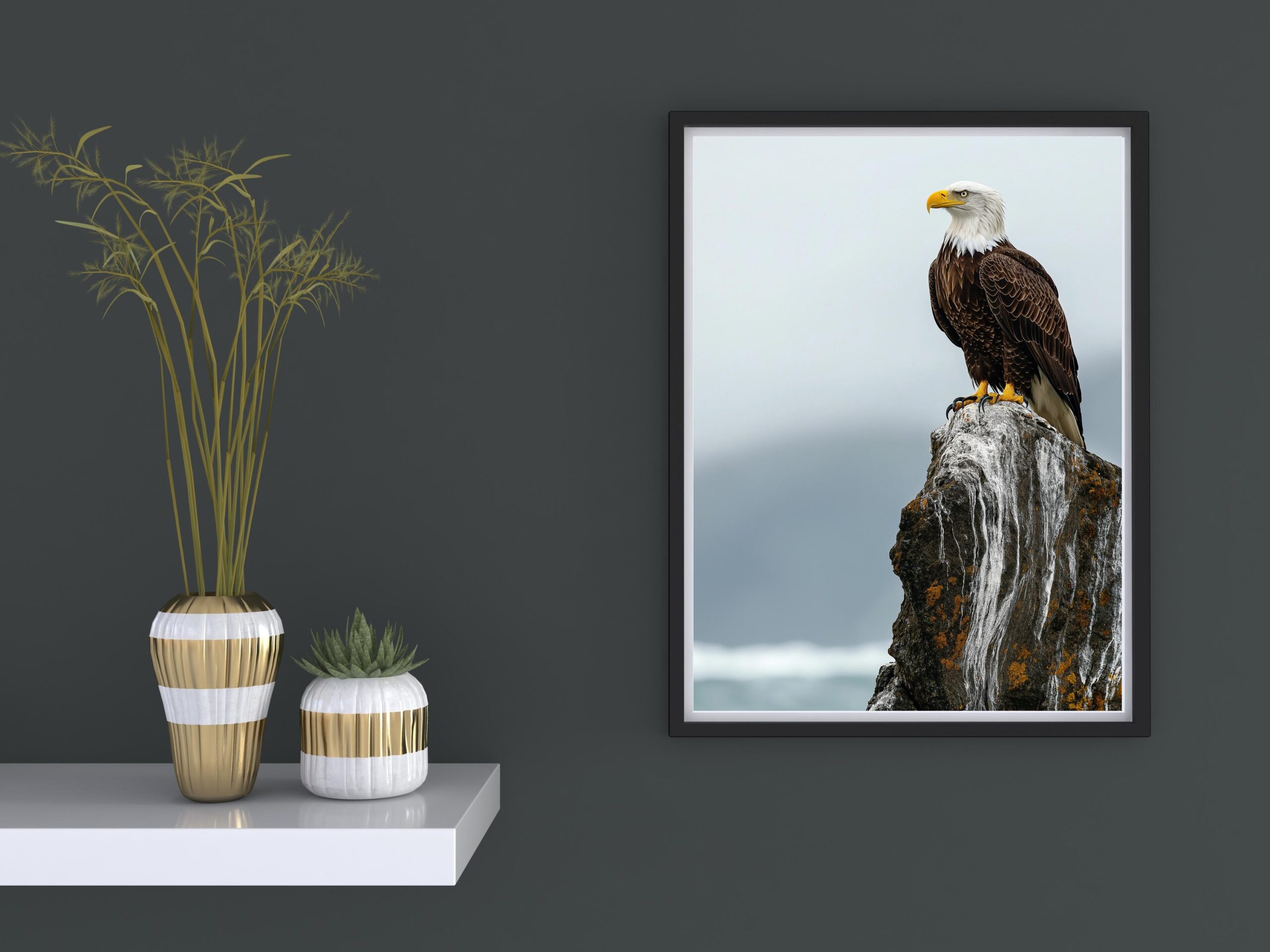 This bald eagle wall art features a majestic eagle perched on a rugged cliff in a serene, misty setting. With rich details and earthy tones, it serves as a captivating centerpiece, perfect for nature enthusiasts and a stylish addition to modern or rustic decors.