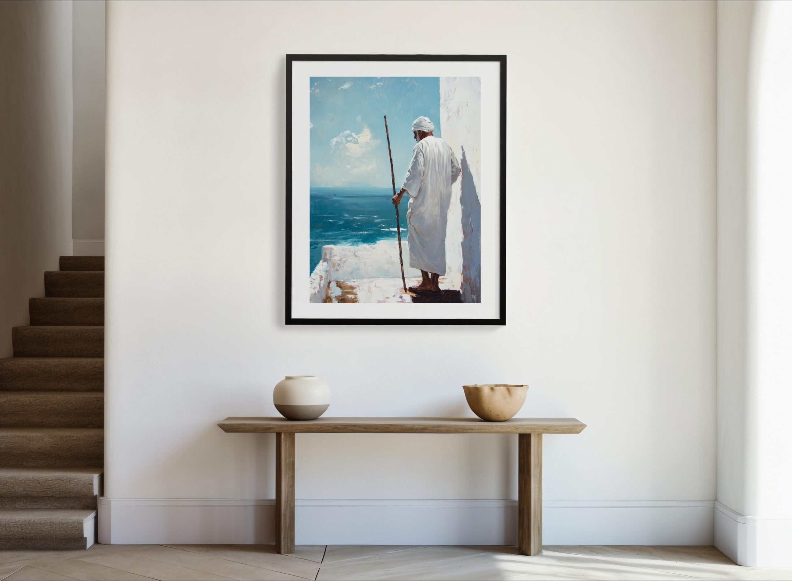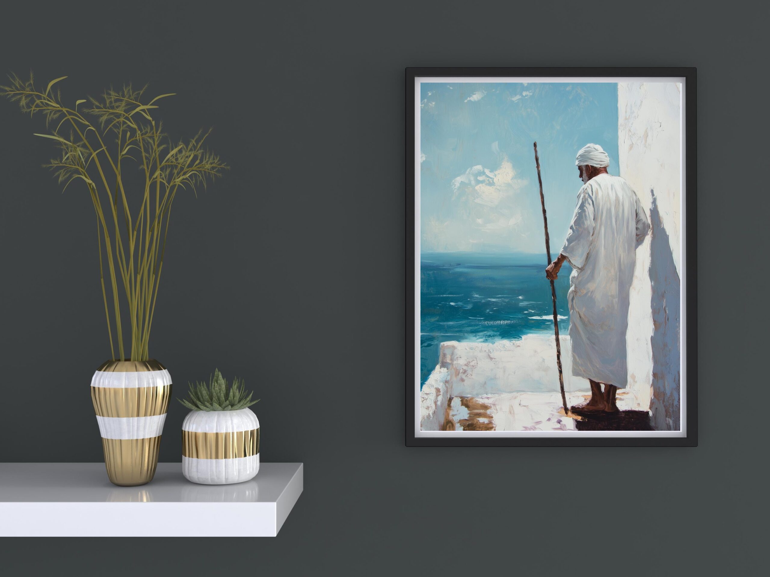 Old man beach house wall art captures the serene essence of coastal living. The scene depicts an elderly man gazing thoughtfully out at the expansive ocean, wrapped in a traditional white robe, leaning gently on a slender staff. The minimalist style offers a calming presence with its soothing blend of azure blues and soft whites, complemented by natural light. Perfect for a tranquil corner in a living room or an inviting bedroom retreat, this artwork transforms the space into a sanctuary of reflection and peace. It also makes a thoughtful gift for those who cherish the sea and its timeless beauty.