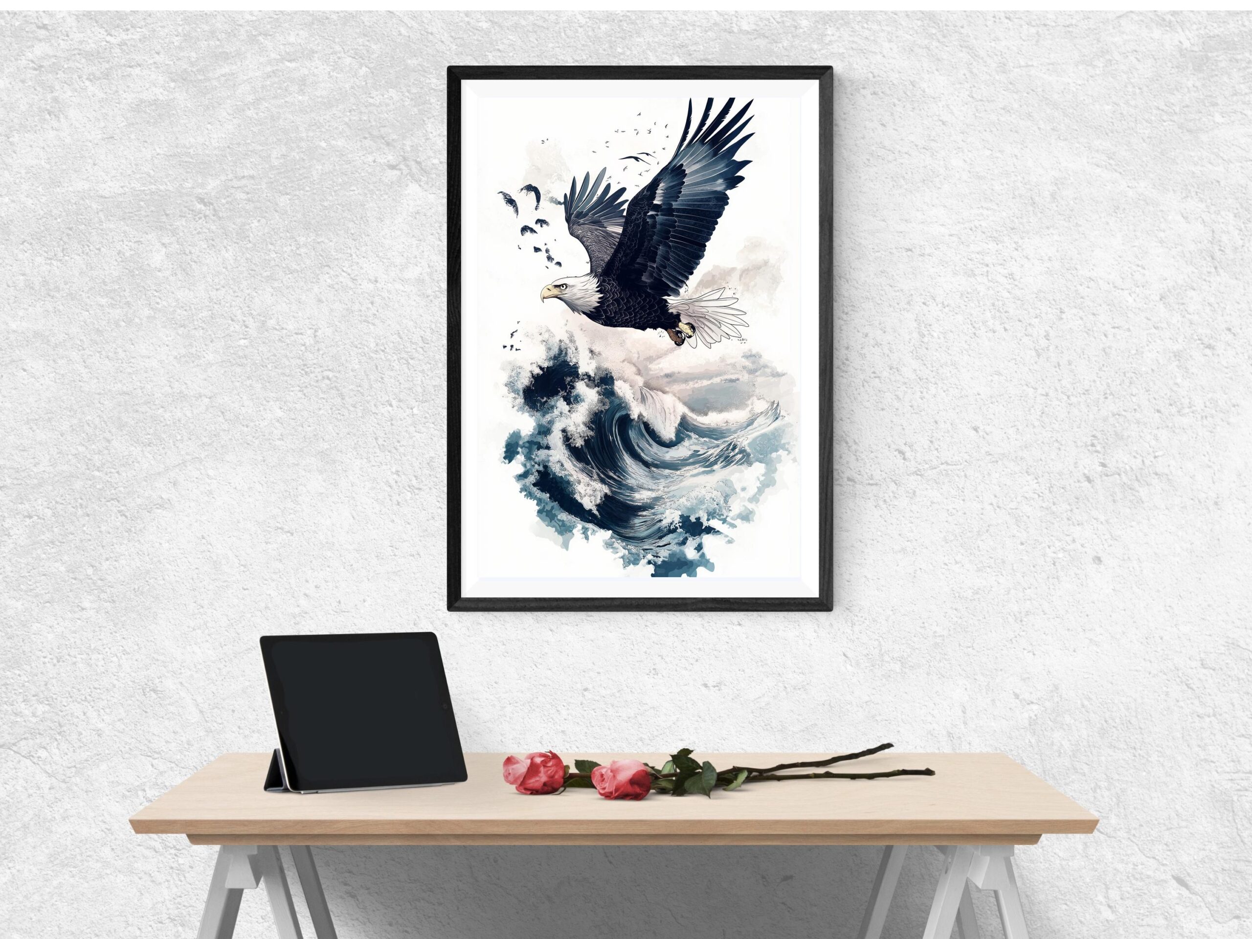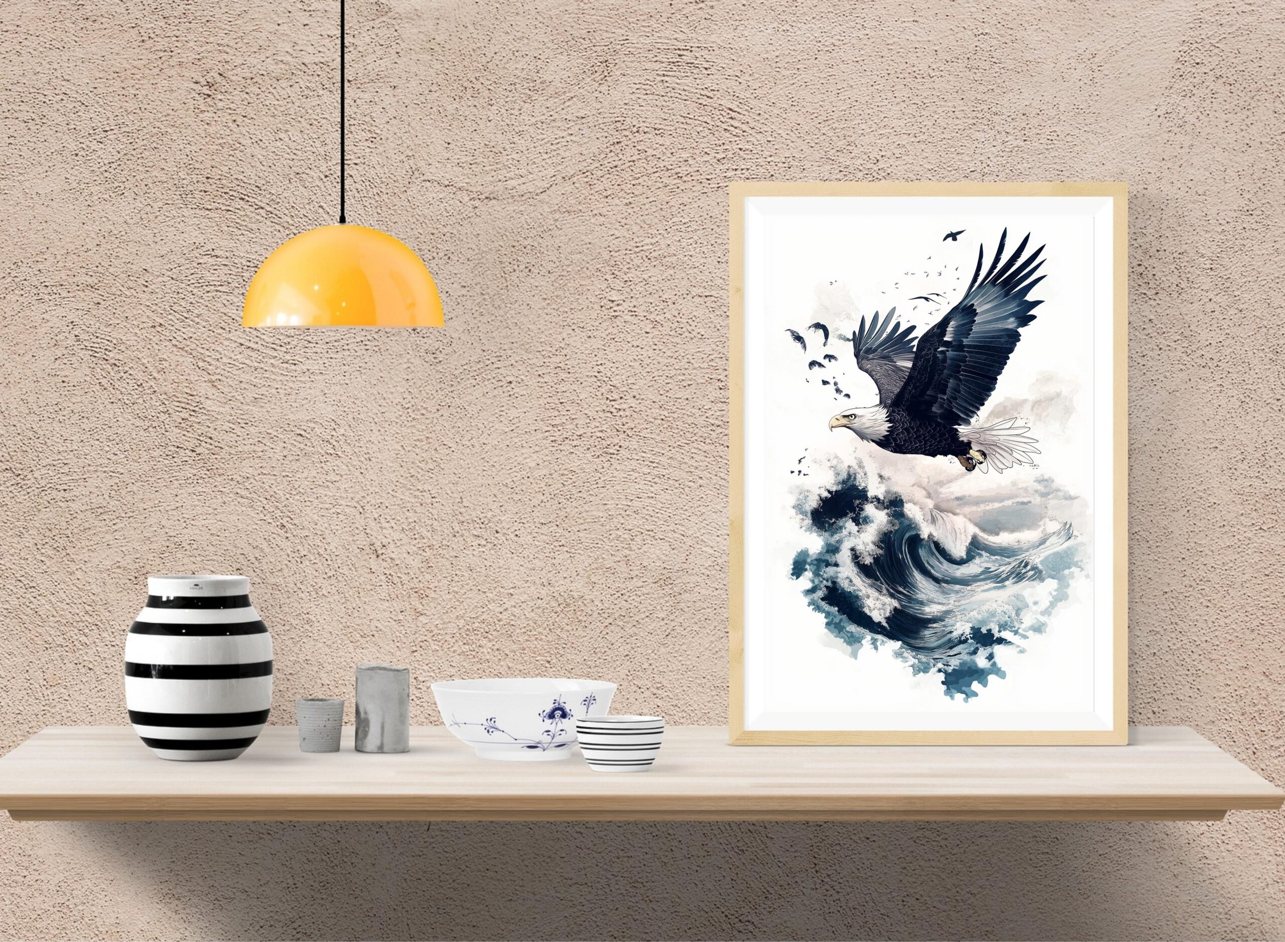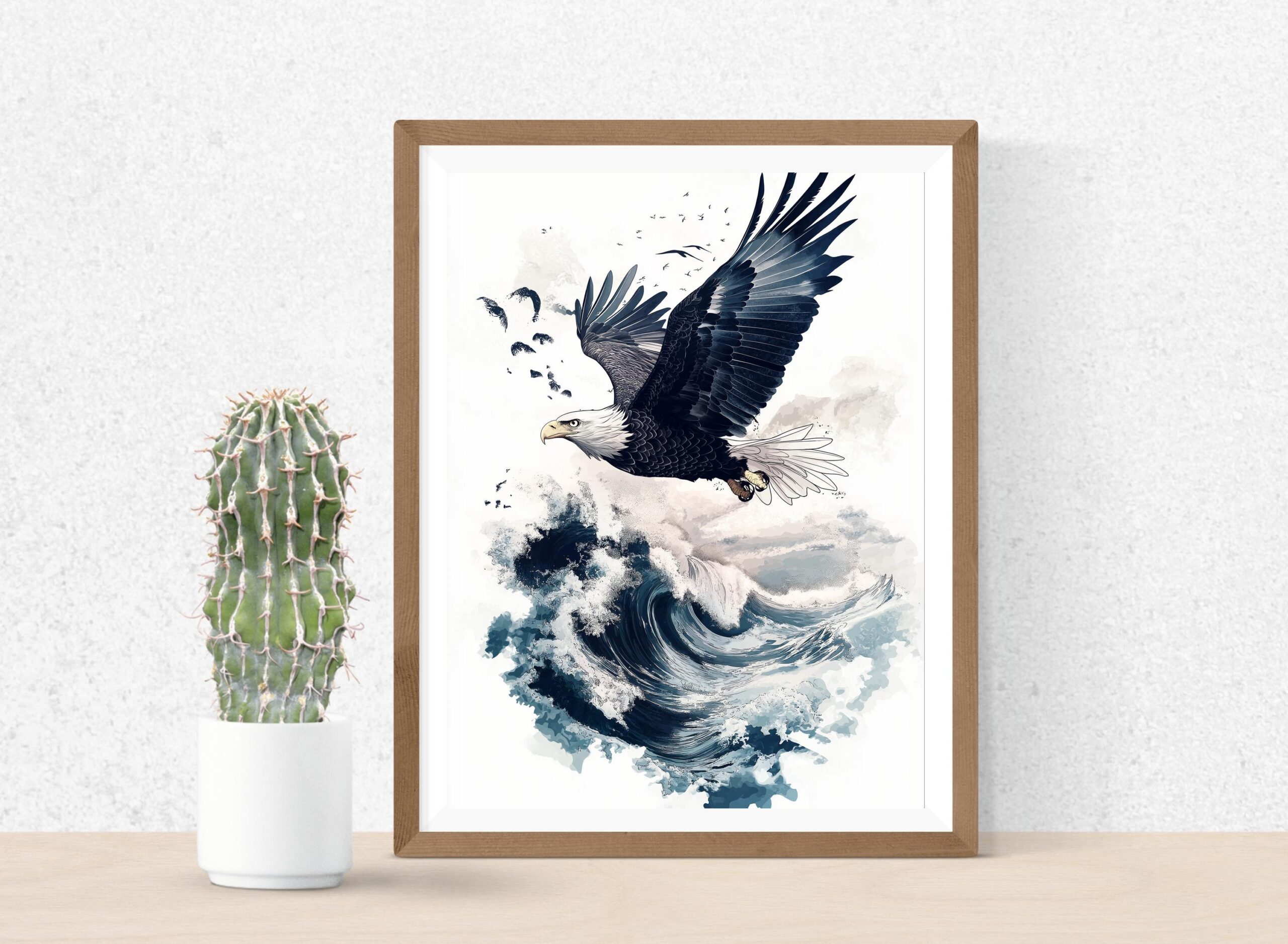 Eagle soaring over ocean waves captures nature and freedom in stunning wall art. The deep blues and soft whites inspire serenity, ideal for living rooms, offices, or bedrooms. An elegant decor piece or thoughtful gift for nature enthusiasts and art lovers, elevating any space’s atmosphere.