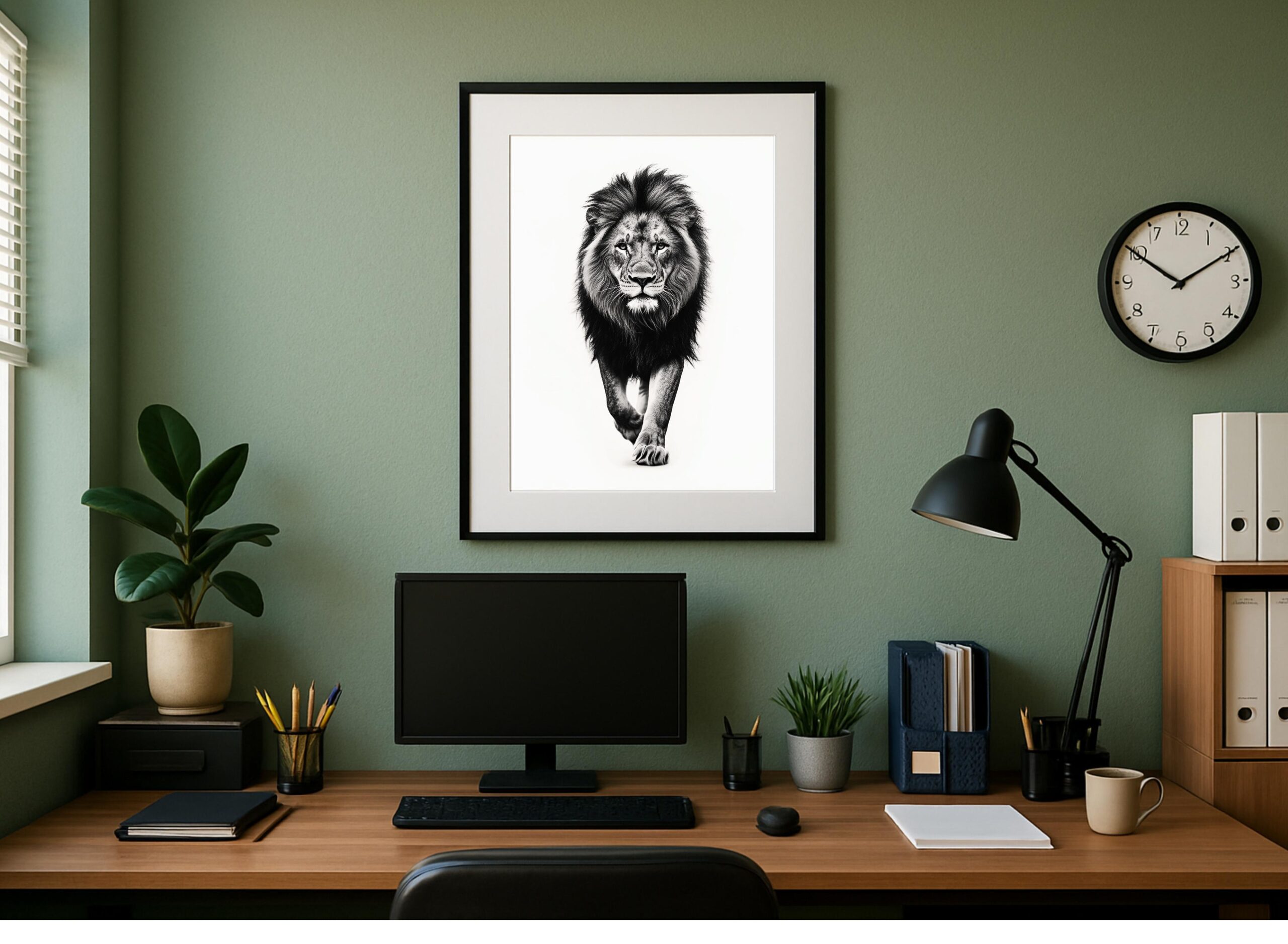 Fearless lion wall art embodies the majestic presence of nature’s king. This striking monochrome piece adds bold elegance and transforms spaces, perfect for modern or Scandinavian interiors, inspiring strength and confidence in any environment.