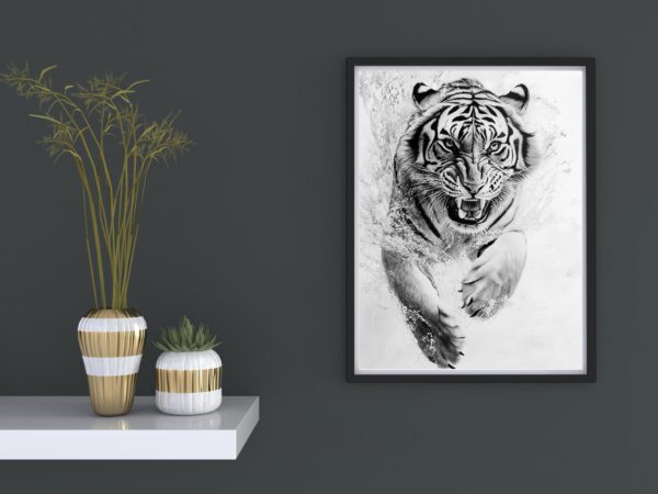 Fierce tiger wall art captures the majestic intensity of a powerful tiger in mid-action, set against a stunning monochrome palette. This modern piece exudes energy and drama, with intricate detailing that brings the scene to life. Bold black and white contrasts create a striking visual impact, perfect for adding a dynamic touch to any space. Ideal for a living room, office, or hallway, this artwork commands attention and inspires a sense of awe. It serves as an elegant reminder of nature’s strength, making it a thoughtful gift for any art enthusiast or nature lover seeking to elevate their surroundings.