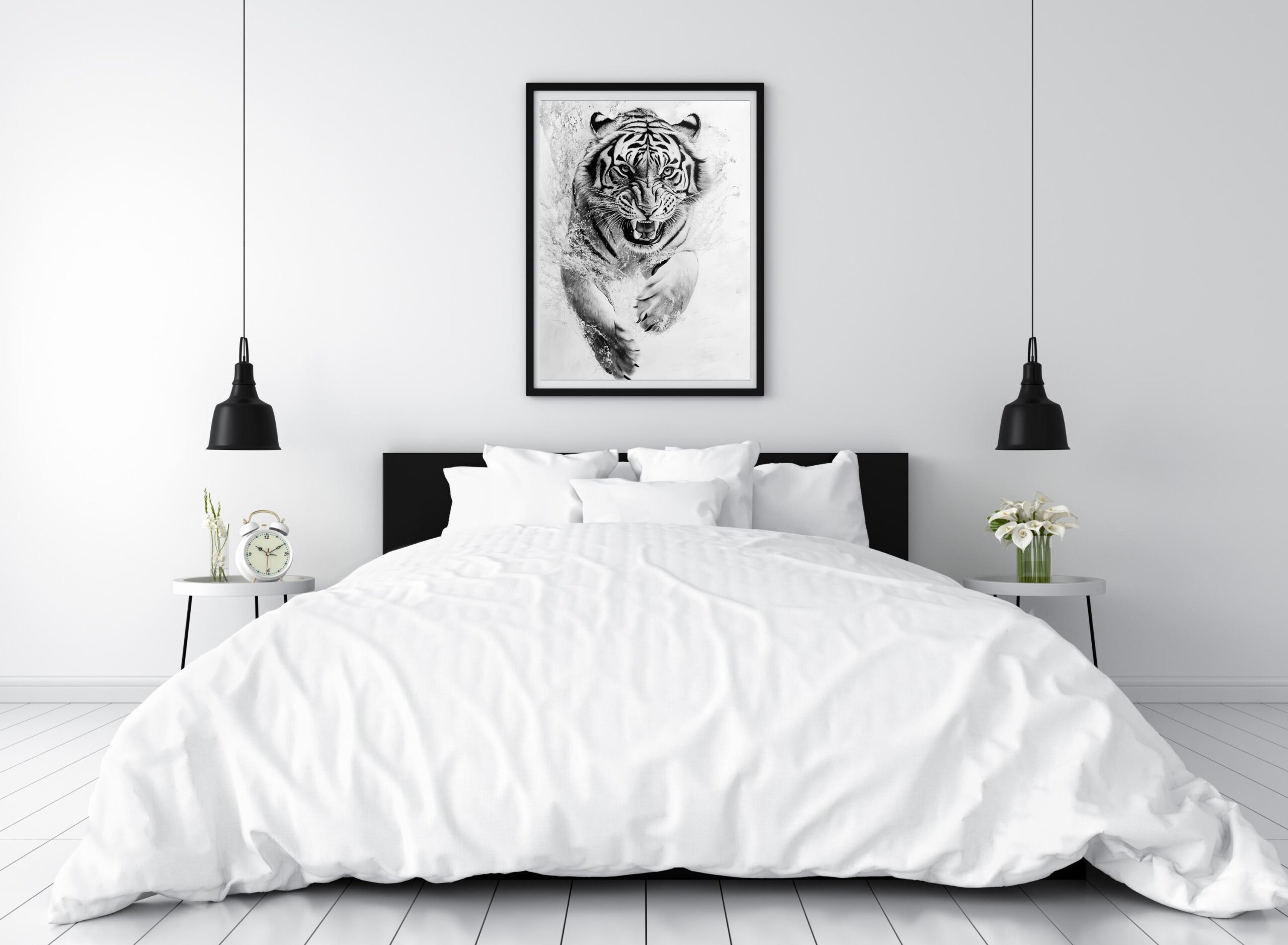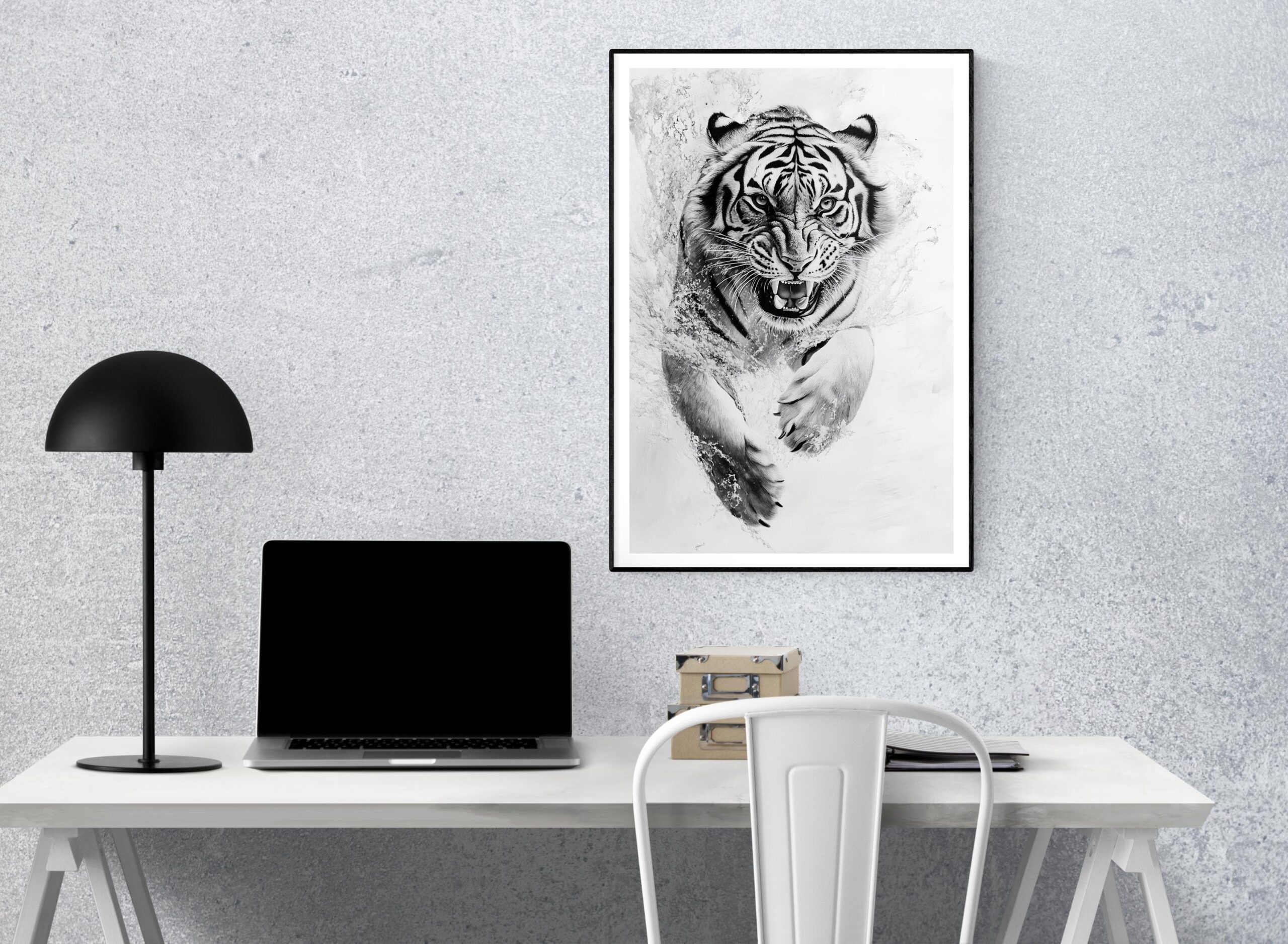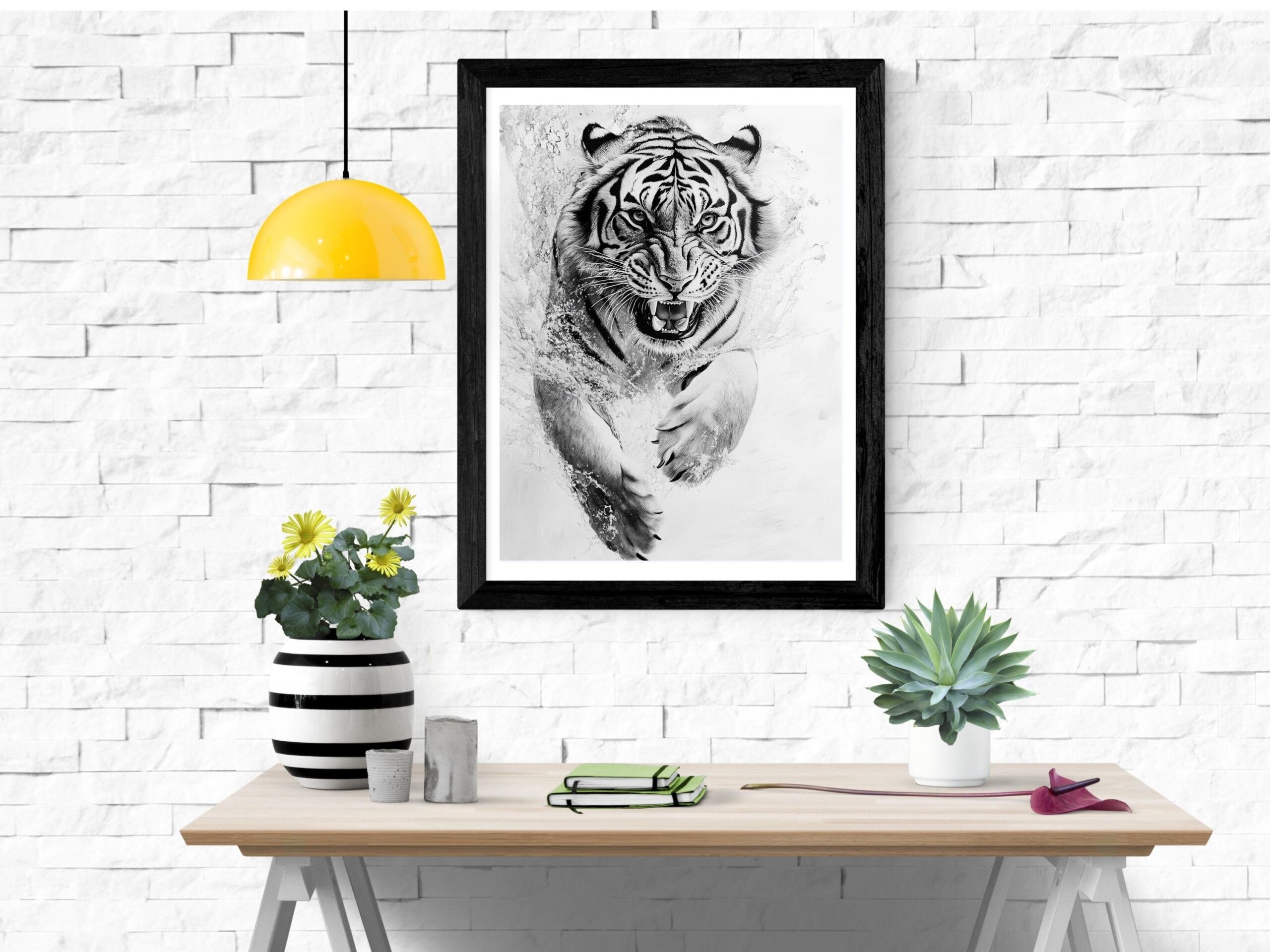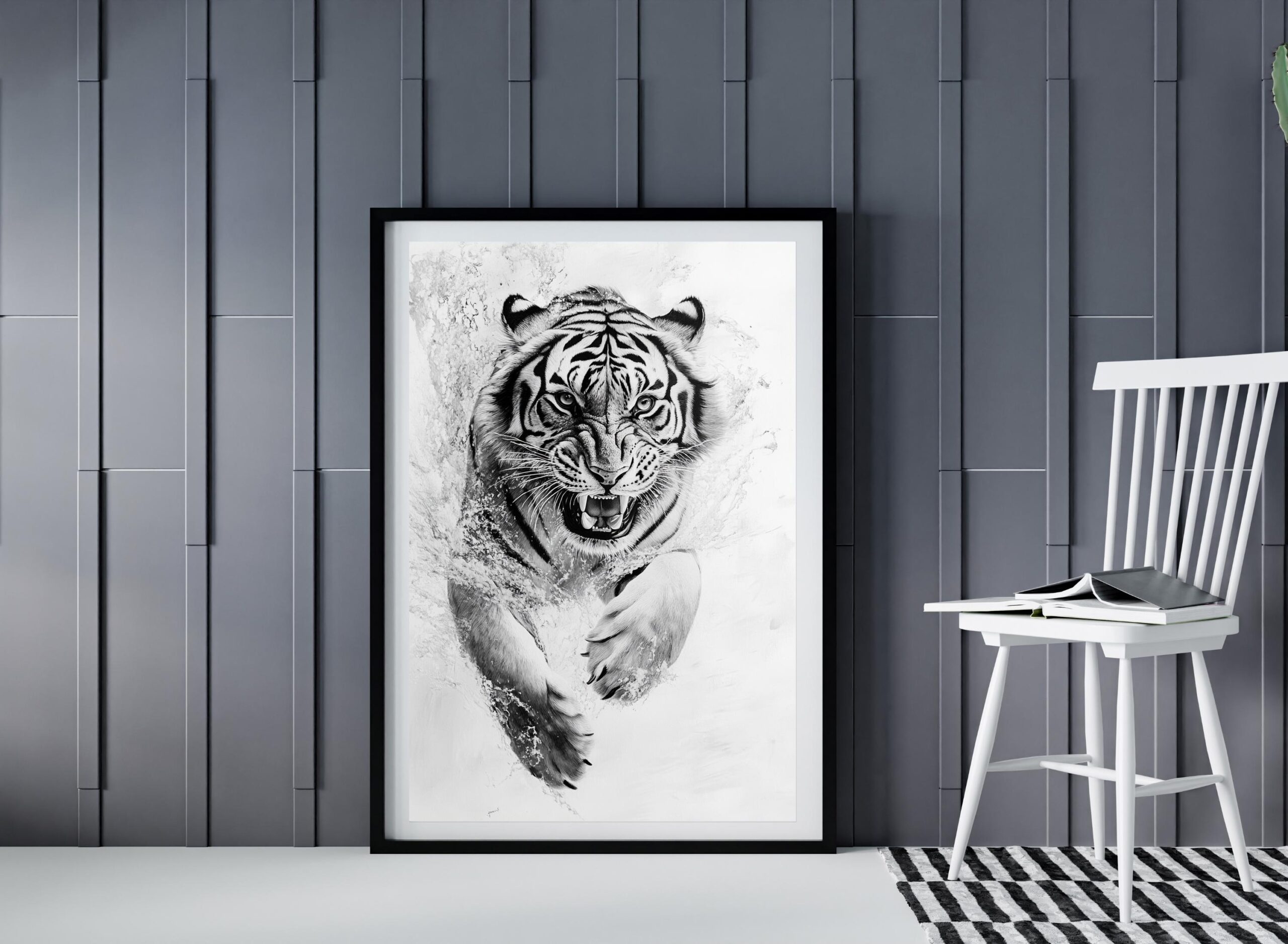 Fierce tiger wall art captures the majestic intensity of a powerful tiger in mid-action, set against a stunning monochrome palette. This modern piece exudes energy and drama, with intricate detailing that brings the scene to life. Bold black and white contrasts create a striking visual impact, perfect for adding a dynamic touch to any space. Ideal for a living room, office, or hallway, this artwork commands attention and inspires a sense of awe. It serves as an elegant reminder of nature’s strength, making it a thoughtful gift for any art enthusiast or nature lover seeking to elevate their surroundings.