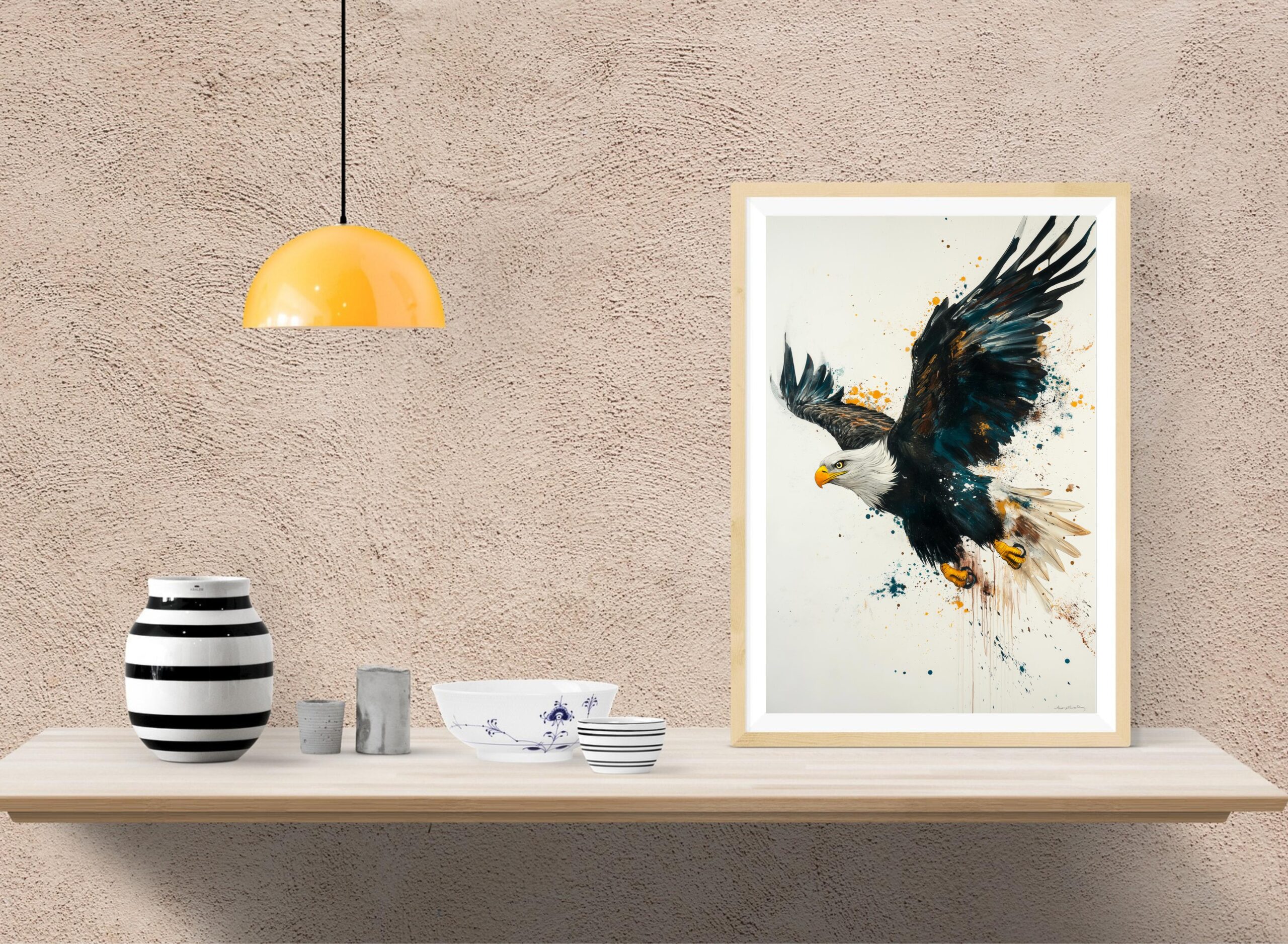 This majestic eagle wall art features a vibrant watercolor design that captures the beauty of flight. The artwork combines energetic strokes and a stunning palette of blues, browns, and oranges, making it a perfect addition to any living room or home office, creating an inspiring focal point.