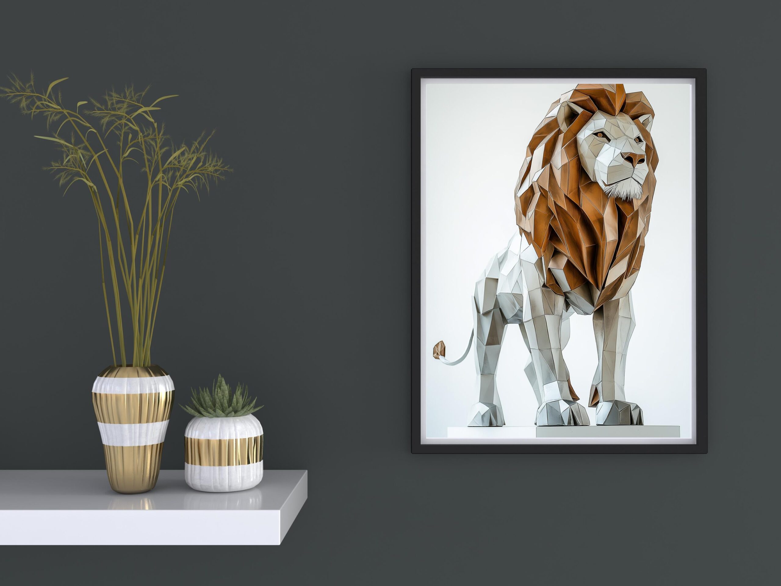 Majestic lion wall art, featuring a stunning geometric design, exudes power and grace with its captivating form. Its minimalist style evokes a modern and sophisticated mood, enhanced by a striking palette of warm browns and cool grays. This artwork brings a bold yet elegant presence to any living room, bedroom, or office. The commanding lion adds a touch of strength and personality, transforming spaces into realms of inspiration and courage. Perfect for those who cherish art that speaks volumes, it’s also an ideal gift for new homeowners seeking to infuse character and charm into their decor.