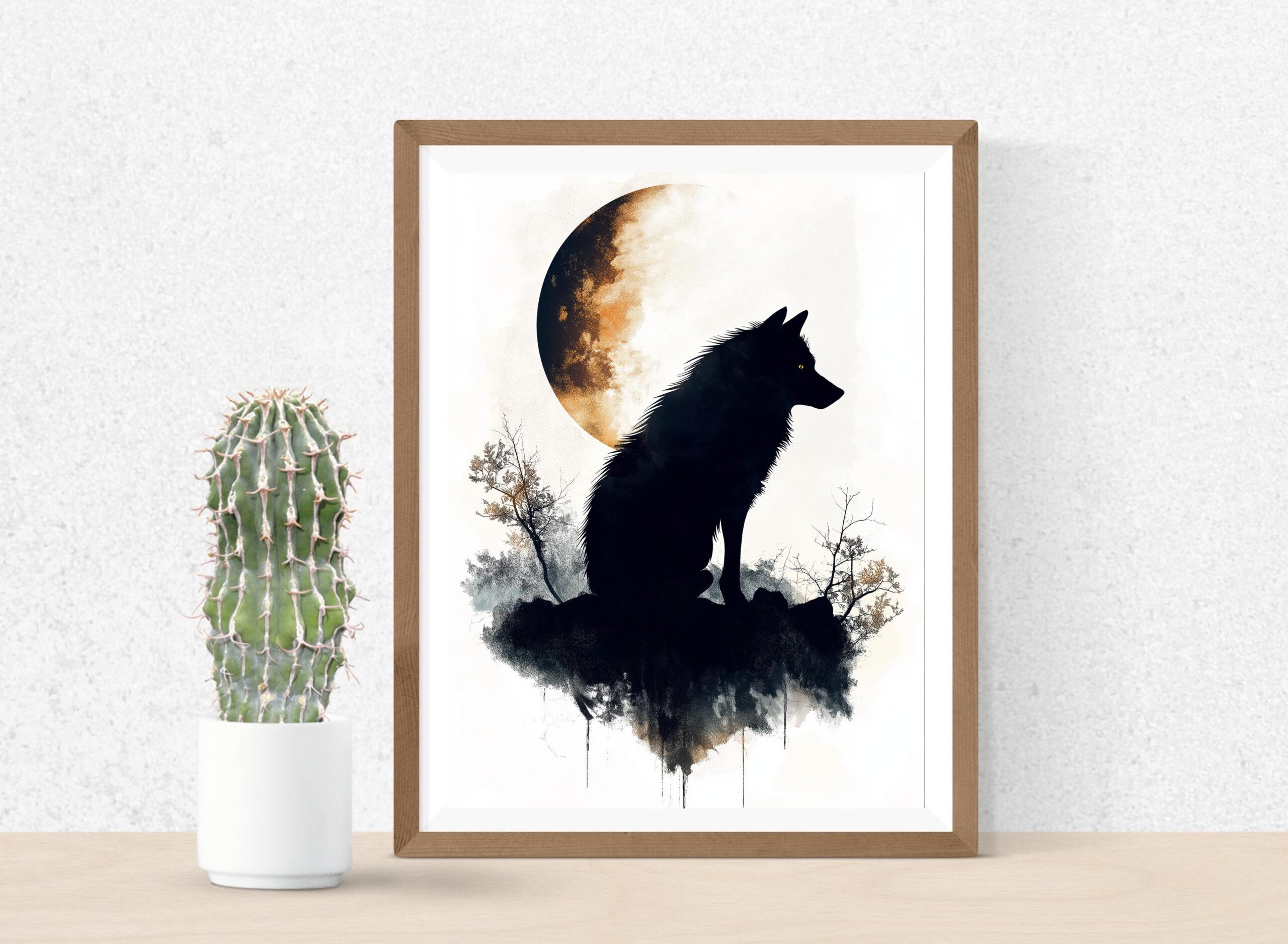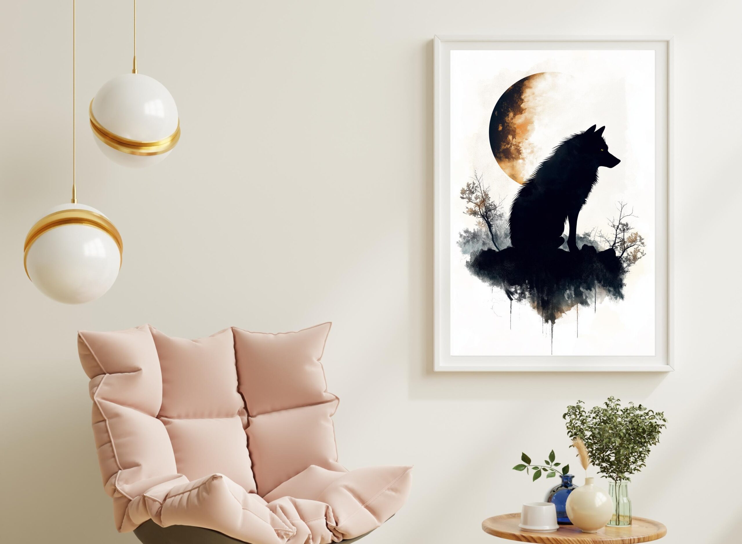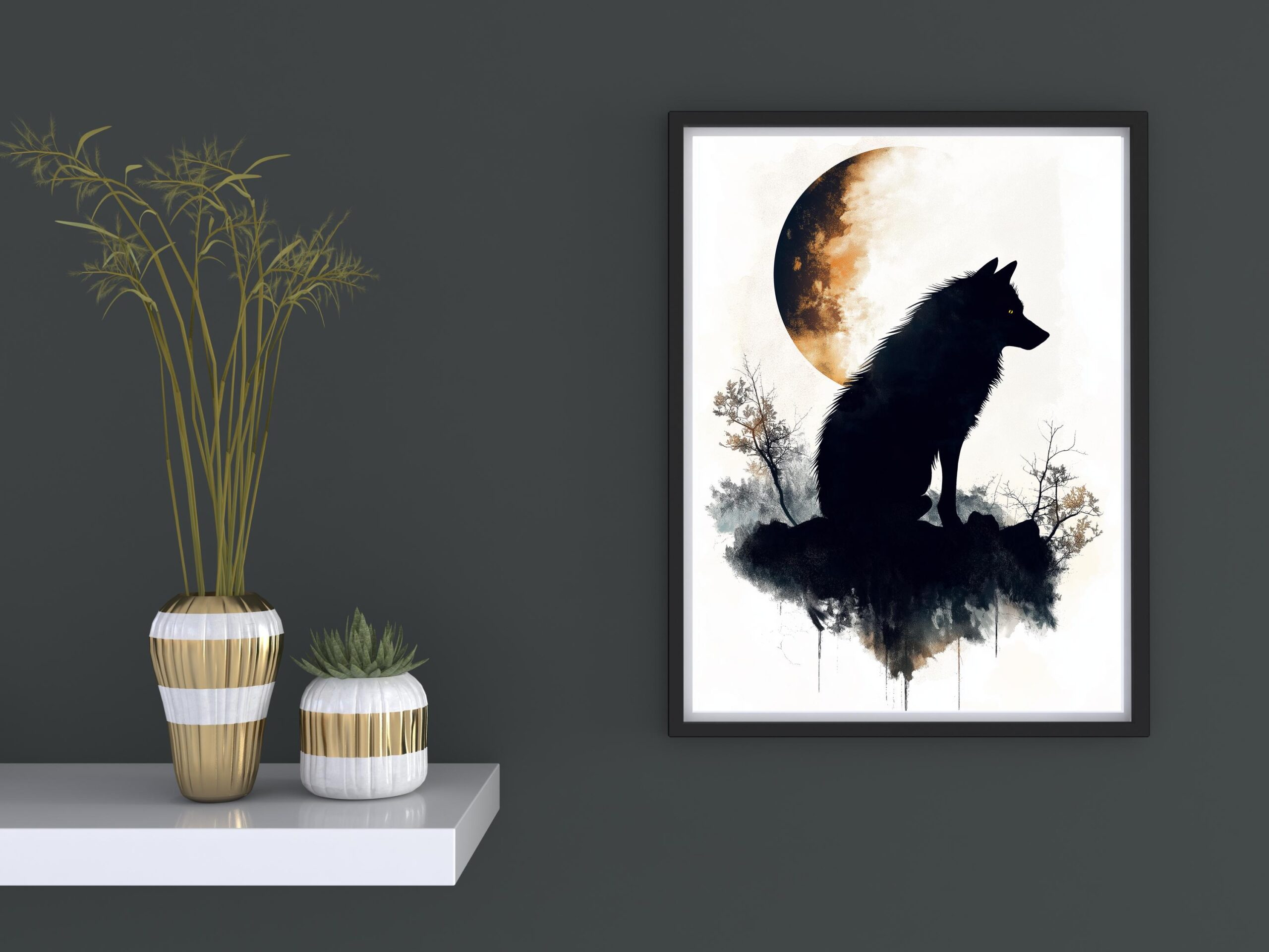 Wolf and moon wall art captivates with its striking silhouette of a lone wolf against a luminous, golden crescent moon. This piece combines elements of nature and mystery, wrapped in a modern minimalist style. The interplay of deep blacks and warm amber tones creates a dramatic yet calming atmosphere. Perfect for a living room, bedroom, or office, this artwork transforms any space into a haven of tranquility and introspective wonder. It’s an invitation to embrace the beauty of the wild, and it makes a thoughtful gift for those creating a new home or seeking inspiration.